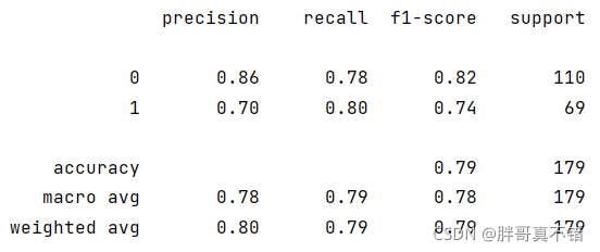 从上图可以看到,分类类型为0的F1分值为0.82;分类类型为1的F1分值为0.74;整个模型的准确率为0.79.