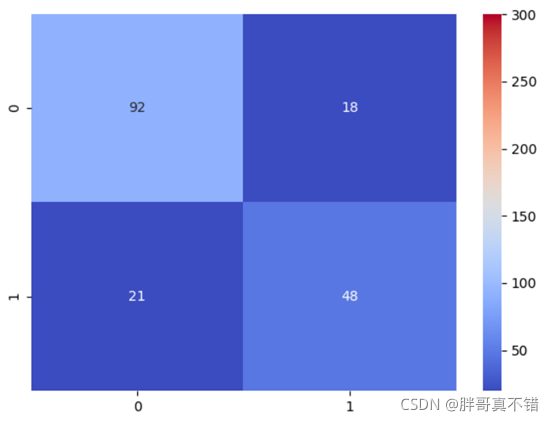 从上图可以看到,实际值为1 预测为0的有21个;实际值为0? 预测为1的有18个;这些是预测错误的。