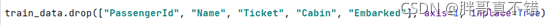 使用Pandas工具的drop方法去掉PassengerId、Name、Ticket、Cabin、Embarked这些数据项,关键代码: