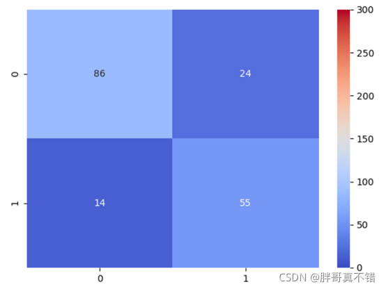 从上图可以看到,实际值为1 预测为0的有14个;实际值为0? 预测为1的有24个;这些是预测错误的。
