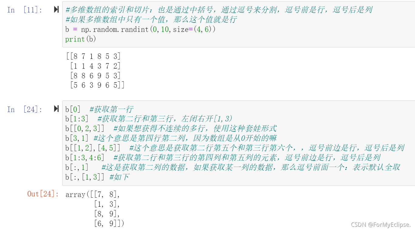 如何创建数组? Numpy经常和数组打交道,所以第一步要学会创建数组。在Numpy中数组的数据类型叫做ndarray。 数组的第一种创建方式:使用np.array([])创建,如上面那张图所示 第二种方式是啥捏,使用np.arange()来创建,其实类似与Python中的range函数  这里实际上也是np.arange(start, end, step),左闭右开[start, end) 第三种创建方式就是使用random函数,也就是np.random.random((行数,列数)),这里是套娃,括号里还有个括号,也不知道为啥,记住就完事儿了。最终生成一个0~1的随机数的多维数组,也是套娃,数组里还有数组。  还是第三种方式,如果说想自定义随机数的范围,那么语法是这样滴:np.random.randint(开始数,结束数,size=(行数,列数)),如下图所示:  第四种方式比较秀,使用函数来生成特殊的数组,话不多说直接上图:  数组中有哪些数据类型呢? 话不多说直接上图  输出数组的维数:.ndim ,表示数组的形状(几行几列):.shape  剩下的不多记了,有需要的去查书。下面是我听的那个老师的总结:  (2)Numpy中多维数组的索引和切片  (3)Numpy中数值的替换操作  (4)数组的形状操作:reshape和resize 这两个东西是有区别的,其中reshape不会改变原数组,而resize会直接把原数组变成新数组。啥意思呢?让我们看下代码  还有两个方法:flatten和ravel,是把数组变成一维
