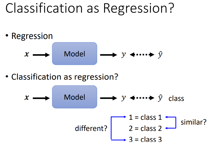 有一个可能,假设你会用Regression的话,我们其实可以把Classification当作是Regression来看。这个方法不一定是个好方法,这是一个比较奇妙的方法,输入一个东西以后,我们的输出仍然是一个scaler,它叫做y。然后这一个y,我们要让它跟正确答案,那个Class越接近越好,但是y是一个数字,我们怎么让它跟Class越接近越好呢,我们必须把Class也变成数字。