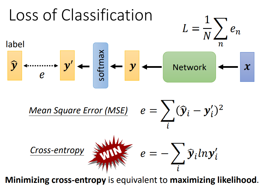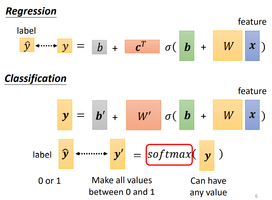 如果是Classification,input x可能乘上一个W,再加上b 再通过activation function,再乘上W'再加上b' 得到y,我们现在的y它不是一个数值,它是一个矢量。但是在做Classification的时候,我们往往会把y再通过一个叫做Soft-max的function得到y',然后我们才去计算y'跟y hat之间的距离。