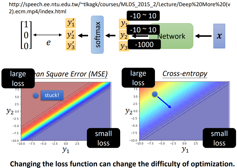 所以这边有一个很好的例子是告诉我们说,就算是Loss function的定义,都可能影响Training是不是容易这件事情,刚才说要用神罗天征,直接把error surface炸平,这边就是一个好的例子告诉我们说,你可以改Loss function,居然可以改变optimization的难度。