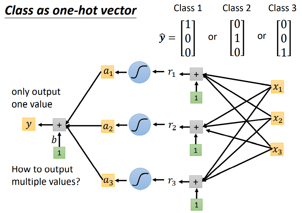 如果我们今天的目标y hat是一个向量。 比如说,?是有三个element的向量,那我们的network也应该要Output的维度也是三个数字才行。到目前为止我们讲的network,其实都只Output一个数值,因为我们过去做的都是Regression的问题,所以只Output一个数字。那怎么改到三个数值呢?