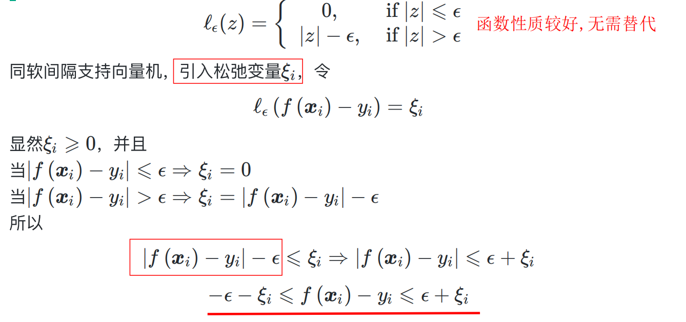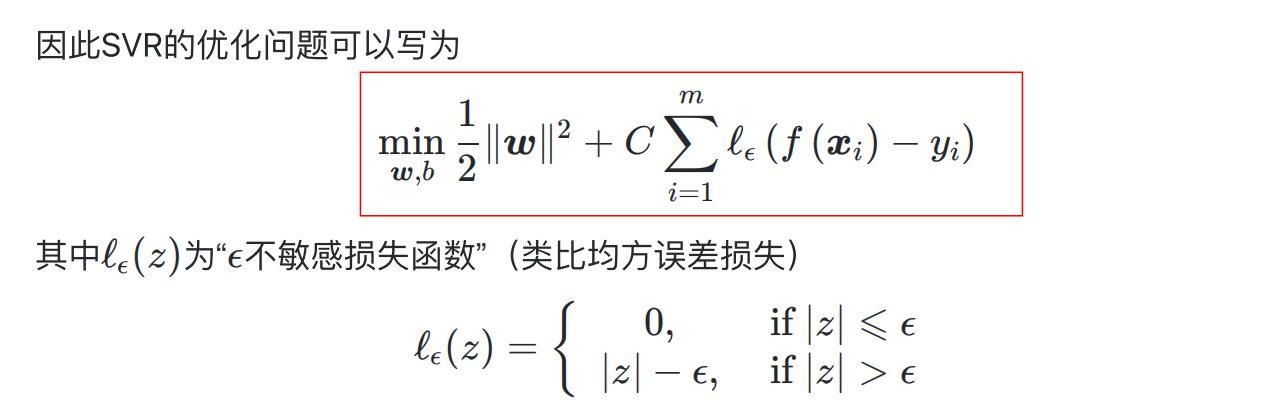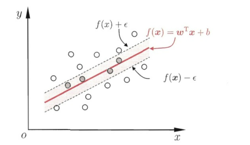 ? ? ? 根本思路:落在带子上的样本不计算损失(类比线性回归在线上的点预测误差为0),不在带子上的则以偏离带子的距离作为损失(类比线性回归的均方误差),然后以最小化损失的方式迫使间隔带从样本最密集的地方(中心地带)穿过,进而达到拟合训练样本的目的。