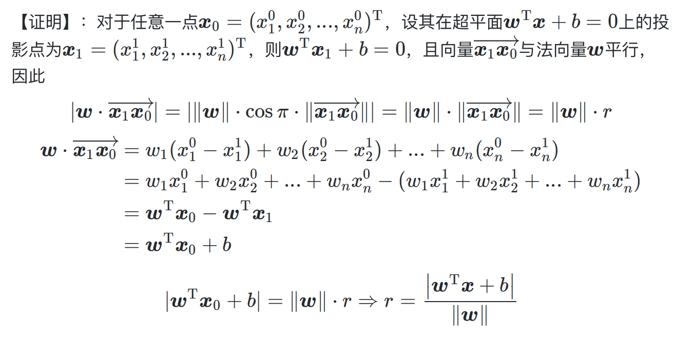 ? ? ? ?在样本空间中,划分超平面可以通过如下线性方程描述: ,其中 为法向量,决定了超平面的方向; 为位移项,决定了超平面与原点之间的距离。样本空间中的任意点 ,其到超平面的距离可以写为 。