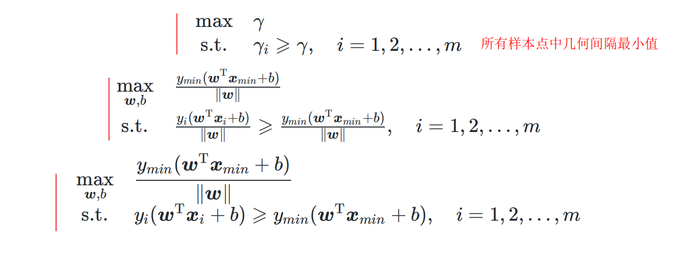 ? ? ? ? 对于给定数据集 ?和超平面 ,定义此数据集关于超平面的几何间隔为:数据集 中所有样本点的几何间隔最小值。 , 。