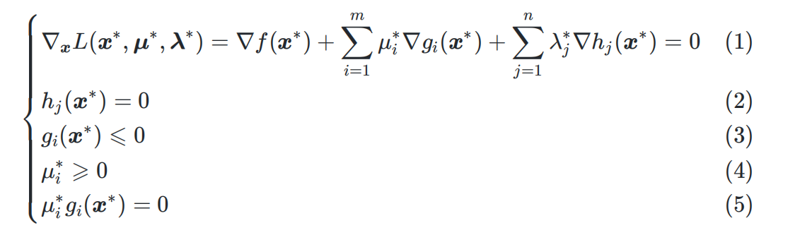 结论:设 、 、 一阶偏导连续, 分别为主问题和对偶问题的最优解,若强对偶性成立,则 满足以下5个 条件: