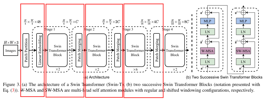 - 金字塔形状:在经过一个 Encoder 之后,会做一个 patch merging 的操作,也就是一个降采样的过程。增大了感受野,减小了分辨率。(不是 Encoder 让感受野变大的,是之后的 patch merging)