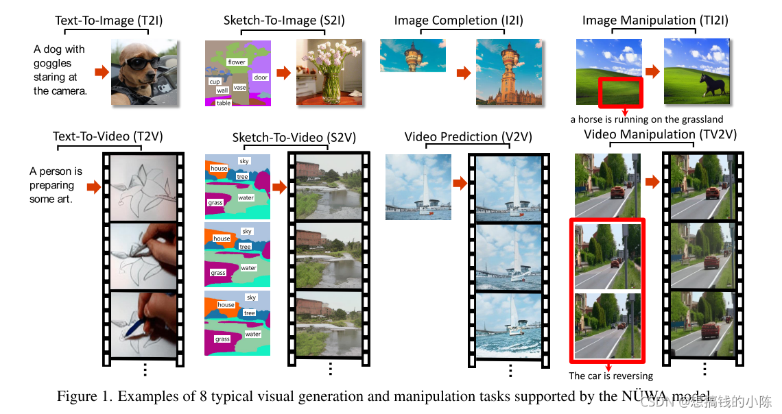 3、在T2I(text-to-image),T2V(text-to-video),Video prediction 等等任务中都达到SOTA结果。并且模型不仅在text-guided image manipulation(文本操控图片)(图一的第一行第四列)展示了很好的zero-shot能力,在text-guide video manipulation(文本操控视频)(图1的第二行第一列)也展示了很不错的能力。