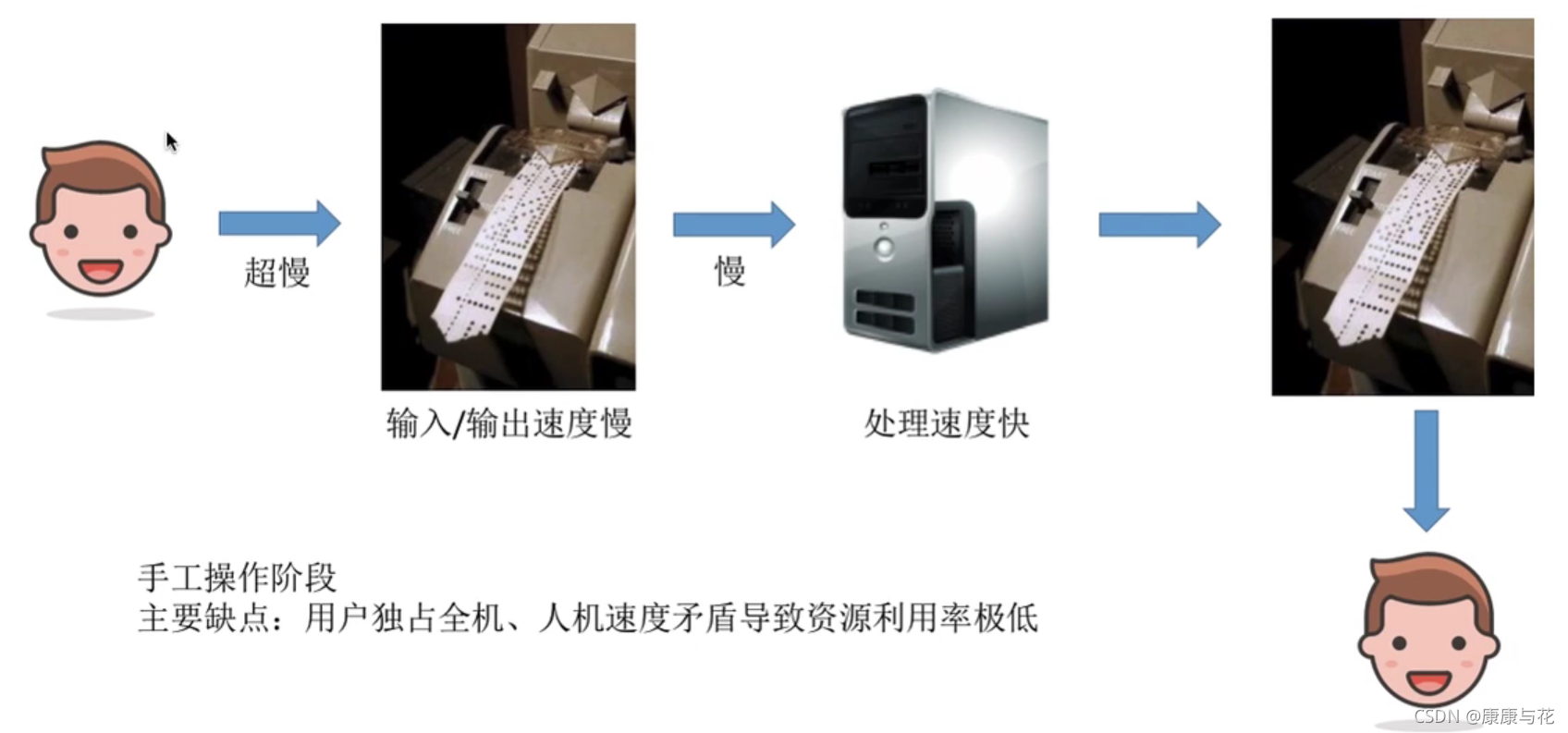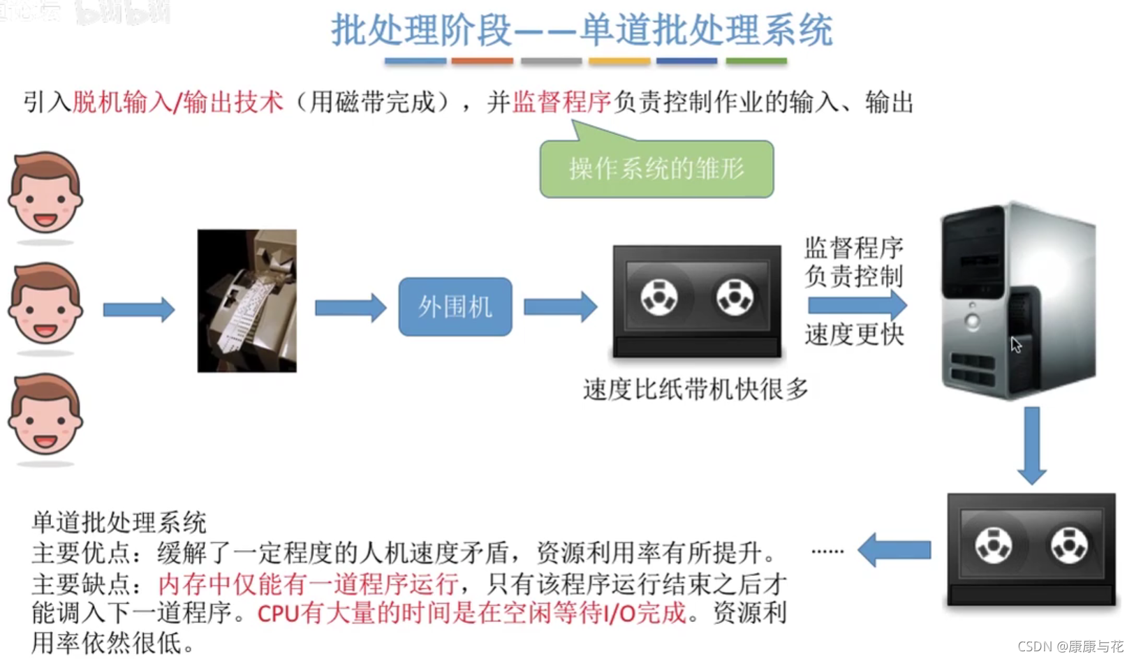 还记得脱机输入嘛,昨天刚解释完,哈哈,我还记得呢,脱机输入就是为了解决慢速输入设备与CPU速度的不匹配问题,可将用户打在卡片上或纸带上的程序和数据通过外围小计算机预先输入到磁带上,运行时再从磁带上高速读入内存。输出也同样可通过磁带中转。由于使用了磁带作为输入/输出的中介,极大地提高了计算机的输入/输出速度。这种具体的输入/输出不需要在主计算机上进行的方式也称"脱机输入/输出"。