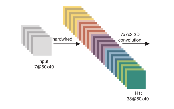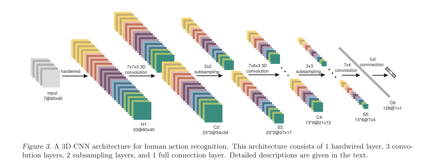 解释一下这里5种颜色的33个Feature map,作者利用 hardwired kernels 生成了灰度、x方向梯度、y方向梯度、x方向光流、y方向光流五种特征信息(gray,gradient-x,gradient-y, optflow-x, and optflow-y),前面三个通道的信息可以直接对每帧分别操作获取,后面的光流(x,y)则需要利用两帧的信息才能提取,因此H1层的特征maps数量:(7+7+7+6+6=33),特征maps的大小依然是60 * 40。 3.3 3D-CNN?3D-CNN架构室友1个hardwired kernels层,三个卷积层,两个下采样层,一个全连接层组成。