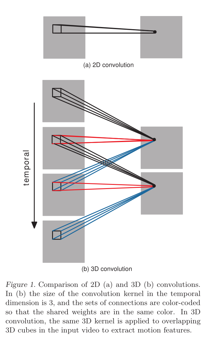 思考一下,如果卷积核数量小于前一层通道数怎么办?这就是3D卷积的思想来源。 ?1.论文背景2D卷积是针对一张原始图像或者视频的一帧进行的特征提取,但是很多场景中多张图片(MRI slices)或者视频的连续帧之间往往存在关联信息,这就是3D CNN提出的背景。3D CNN主要是为了解决图片之间的关联信息,增加一个新的维度信息。 2.Flash point2D CNN主要将视频的一帧作为输入,但这就忽略了各帧之间的关联信息。而3D CNN以连续的多帧作为输入,增加了时间维度的信息,能够提取到更具表达性的特征。 3.论文细节3.1 3D卷积3D卷积的突出特点:卷积核数量小于前一层通道数 如果是2D卷积应该就是一个卷积核数量为4的滤波器去卷积产生一张Feature Map。但是3D卷积共享一个卷积核产生了多张Feature Map,这些Feature Map之间包含着时间维度的信息,即连续帧之间的关联信息。