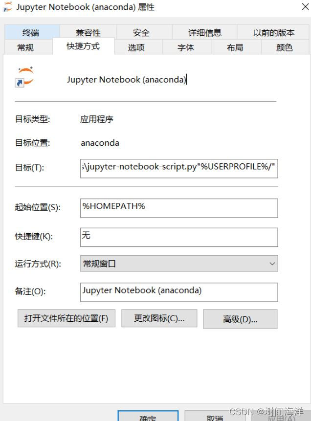 此时,如果你还没有成功,在win开始菜单中找到jupyter notebook快捷图标,鼠标右键>>更多>>打开文件位置>>目标,然后右击Jupyter Notebook(anaconda)文件,打开属性,删除目标里的"%USERPROFILE%/",这一行语句。