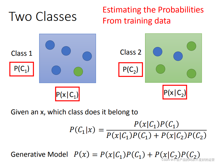 将上面两个盒子换成两个类别: 若知道红色方框的值,就可以计算出给一个x,它是属于哪个类型的,P(C1|x) 和 P(C2x) ,谁大就属于谁。接下来就需要从训练集中估测红色方框中的值