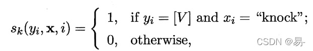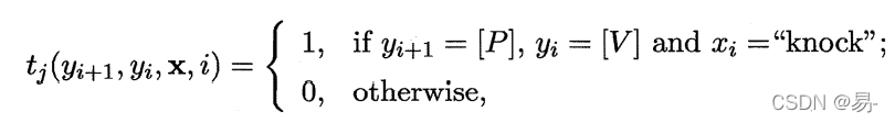 表示:若第i个观测值xi为单词"knock"时,相应的标记yi和yi+1很可能是[V]和[P]。