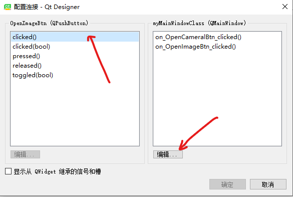 编辑完代码后,需要进行如下操作,将按钮与槽函数(on_OpenImageBtn_clicked() 和on_OpenCameraBtn_clicked() )关联起来。
