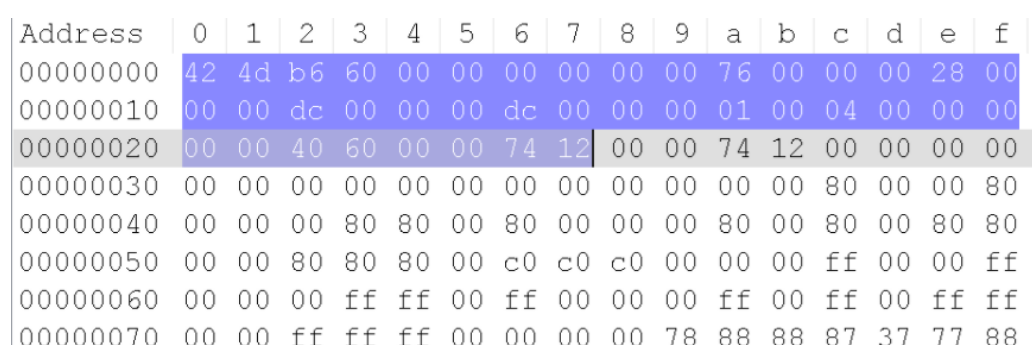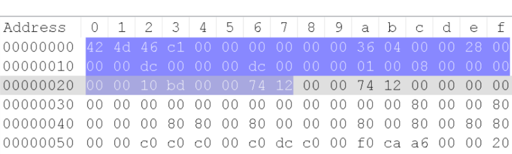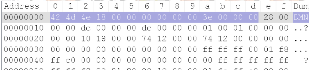 4.头文件的大小计算: 0~1 两个字节为文件类型,0x4d42为固定BM 2~5 四个字节为文件大小,0x184e,即6222 6~9 四个字节为保留字段,全0 a~d 四个字节为从文件头到实际的位图数据的偏移字节数 12~15 四个字节表示图片宽度,0xdc为220 16~19 四个字节表示图片高度,0xdc为220 1a~1b 两个字节,恒定为0x1 1c~1d 两个字节表示像素占的比特,这里为0x1即两种颜色,16色为0x4即16种颜色,256色为0x8即256种颜色 1e~21 四个字节表示图片是否压缩,0x0表示不压缩 22~25 四个表示图像大小,0x1810为6160 26~29 四个字节表示水平分辨率 2a~2d 四个字节表示垂直分辨率 23~31 四个字节表示实际使用的颜色索引数 32~35 四个字节表示重要的颜色索引数