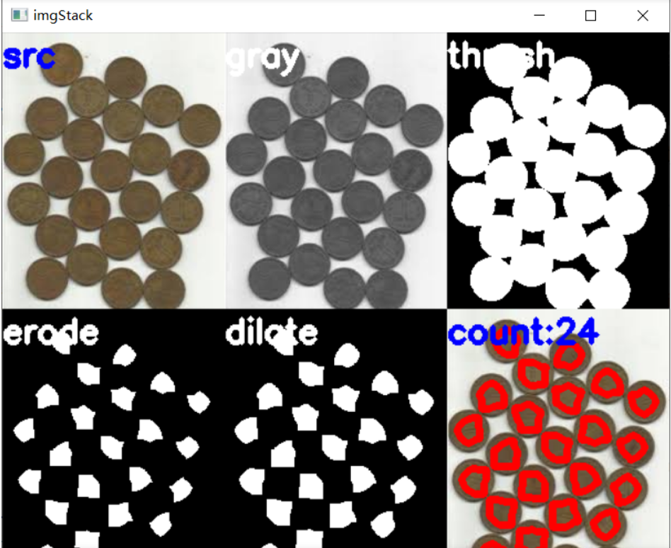 2)采用图像的开闭运算(腐蚀-膨胀),检测出2个样本图像中硬币、细胞的个数
