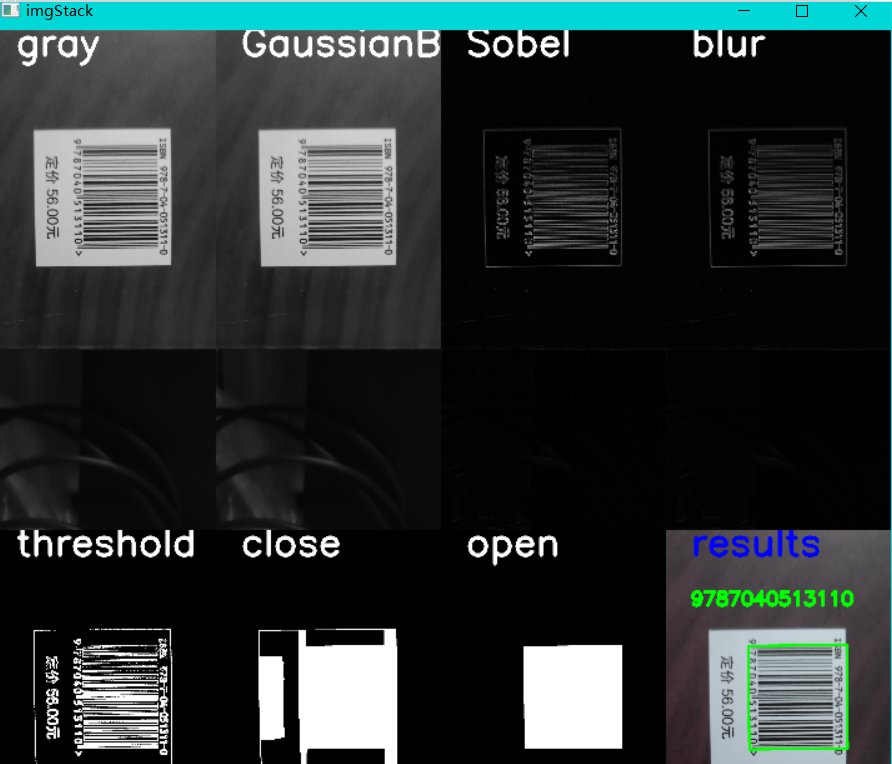 3) 采用图像梯度、开闭、轮廓运算等,对图片中的条形码进行定位提取;再调用条码库获得条码字符