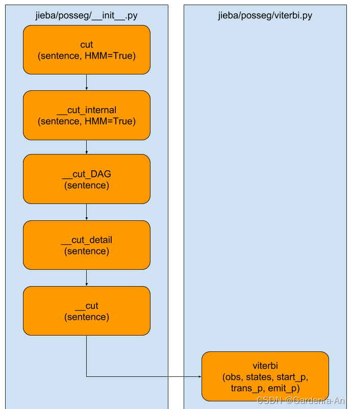 下图为jieba/posseg/__init__.py及jieba/posseg/viterbi.py两个文件中相关函数之间的关系。