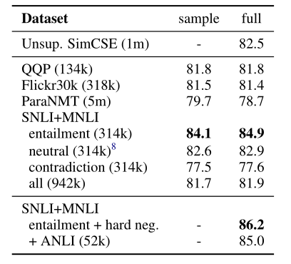 作者分别尝试在不同的语义匹配数据集(QQP、Flickr、ParaNMT等)上训练模型,在STS-B上测试模型,结果如下:  其中sample列表示采样相等样本量训练的结果,full表示使用完整数据集训练的结果,作者发现NLI训练出来的模型性能是最好的,这是因为NLI数据集的质量本身很高,正样本词汇重合度非常小(39%)且负样本足够困难,而QQP和ParaNMT数据集的正样本词汇重合度分别达到了60%和55%。
