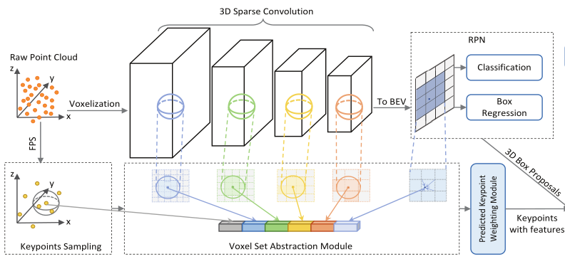 - 提出voxel-to-keypoint方案,在多尺度下将体素特征编码到一个关键点集中,不仅保持了准确的位置,而且丰富了场景特征信息;