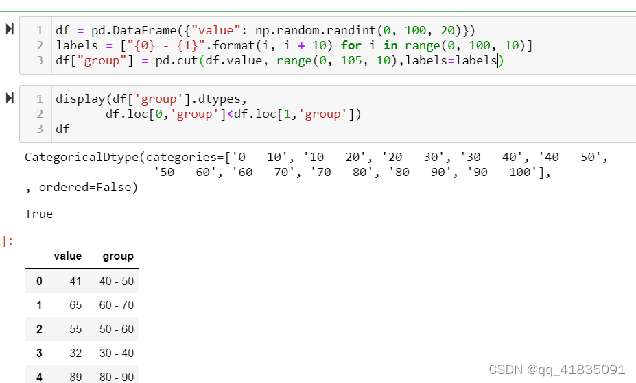 输出: [‘0 - 9’, ‘10 - 19’, ‘20 - 29’, ‘30 - 39’, ‘40 - 49’, ‘50 - 59’, ‘60 - 69’, ‘70 - 79’, ‘80 - 89’, ‘90 - 99’]