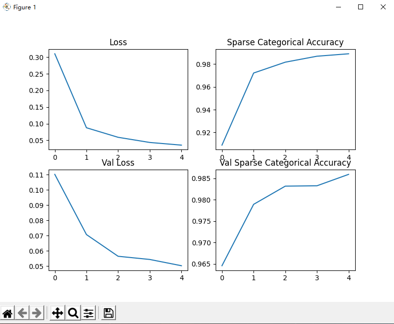 History返回了4个参数,分别是['loss', 'sparse_categorical_accuracy', 'val_loss', 'val_sparse_categorical_accuracy'],就是训练集的损失和精确度,和测试集的损失和精度。