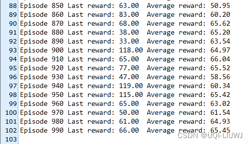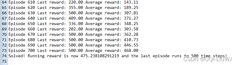 ?可以看到它在进行700个episode的时候就结束了(平均reward大于475)?