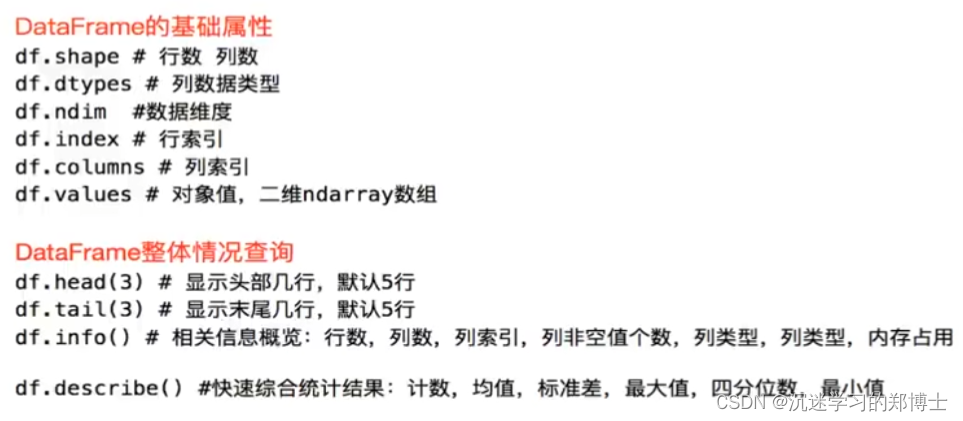 对于DataFrame的基础属性与整体情况可以参照下图方法进行了解: