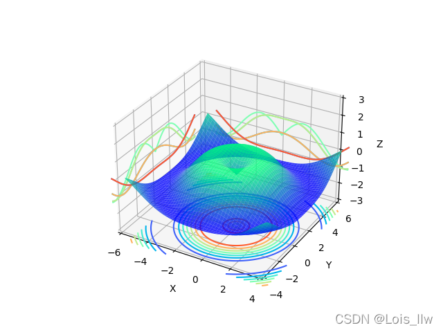 ax4.contour(X,Y,Z,zdir='z', offset=-3,cmap="rainbow") #生成z方向投影,投到x-y平面,offset表示离视角轴0点的距离