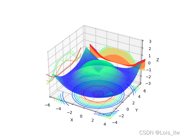 ax4.contour(X,Y,Z,zdir='x', offset=-6,cmap="rainbow") #生成x方向投影,投到y-z平面