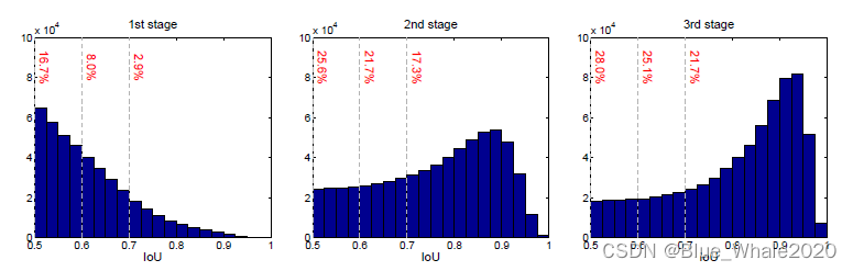 然后这张图  首先看每一个stage样本均值和样本方差,很明显的看出随着每一个stage的迭代,样本方差是在稳定的减小,说明蓝点的排列是越来越紧密集中了,就是越来越与gt接近(这个肉眼观察不是很明显,但是还是能看出来的,就是中间的蓝色区域越来越深了) 如果这时候在每一个stage都用相同的IOU,比如0.5来卡的话,就会带来很多的离群点,这个效果感觉在上图不是很明显,见下图,下图能看出随着stage的逐步迭代,IOU的”质量“越来高,如果每次都以0.5来卡,就会引入很多“错误box”,这也就是为什么原文说: