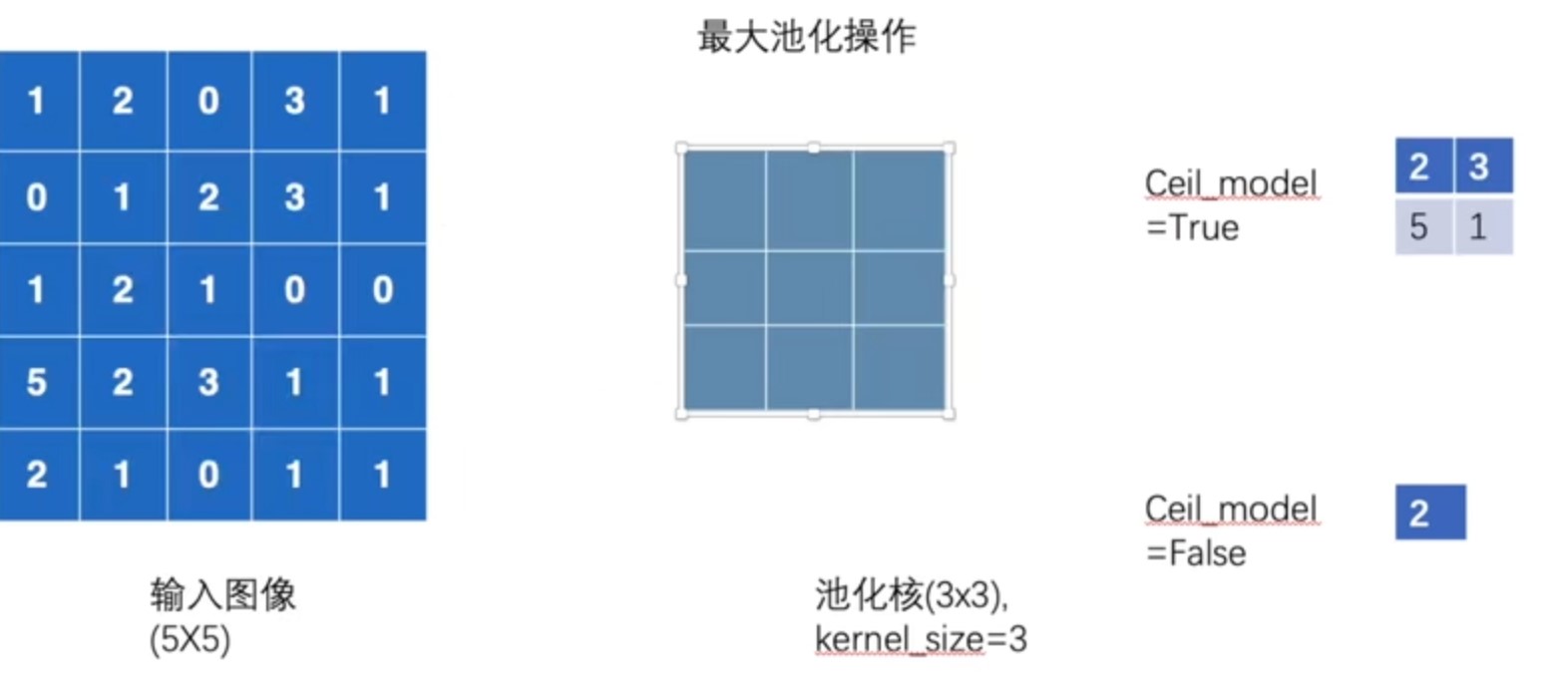 kernel_size :窗口的大小以达到最大值stride :窗口的步幅。默认值为kernel_size padding :要在两侧添加隐式零填充dilation : 控制窗口中元素步幅的参数return_indices :如果True ,将返回最大索引和输出。ceil_mode :当为 True 时,将使用ceil而不是floor来计算输出形状