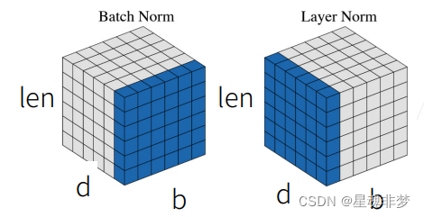 这里,对NLP任务,b为 batch,d为tokens的维度, len 为序列的长度。所以,由于序列是变长的,所以不适用于Batch Norm。右图的LN 是对当前样本(序列)进行的归一化。