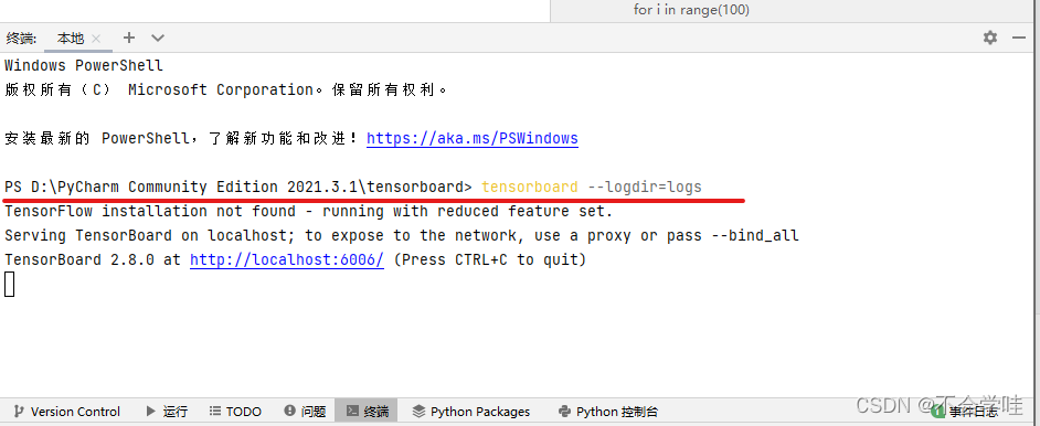 writer = SummaryWriter("logs")#这个咱们只需要给他一个文件的名称 即folder location