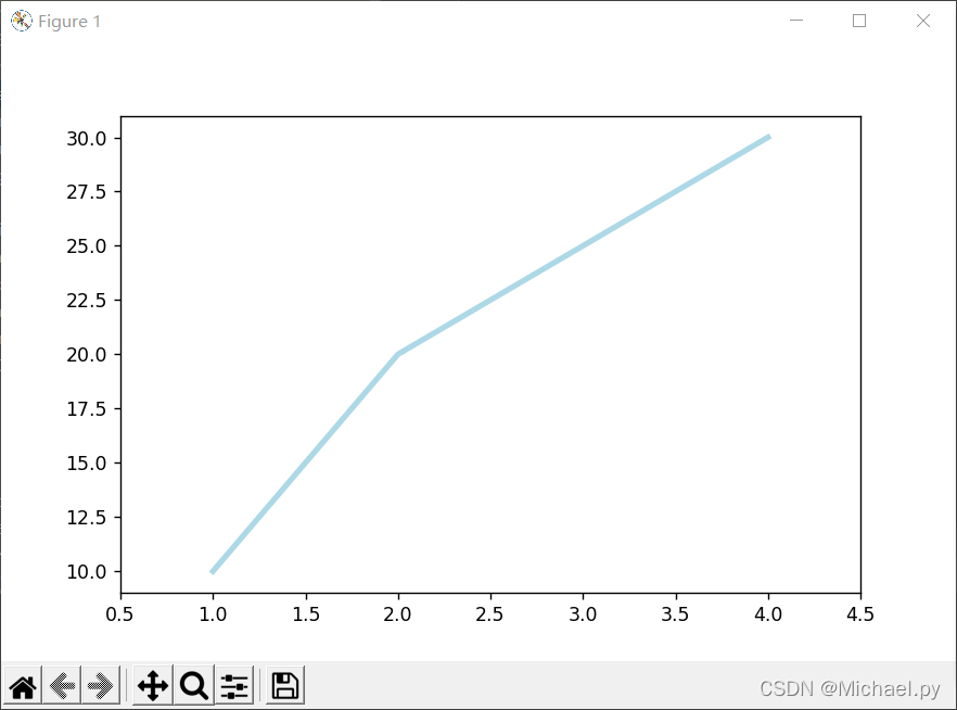 plt.plot([1, 2, 3, 4], [10, 20, 25, 30], color='lightblue', linewidth=3)
