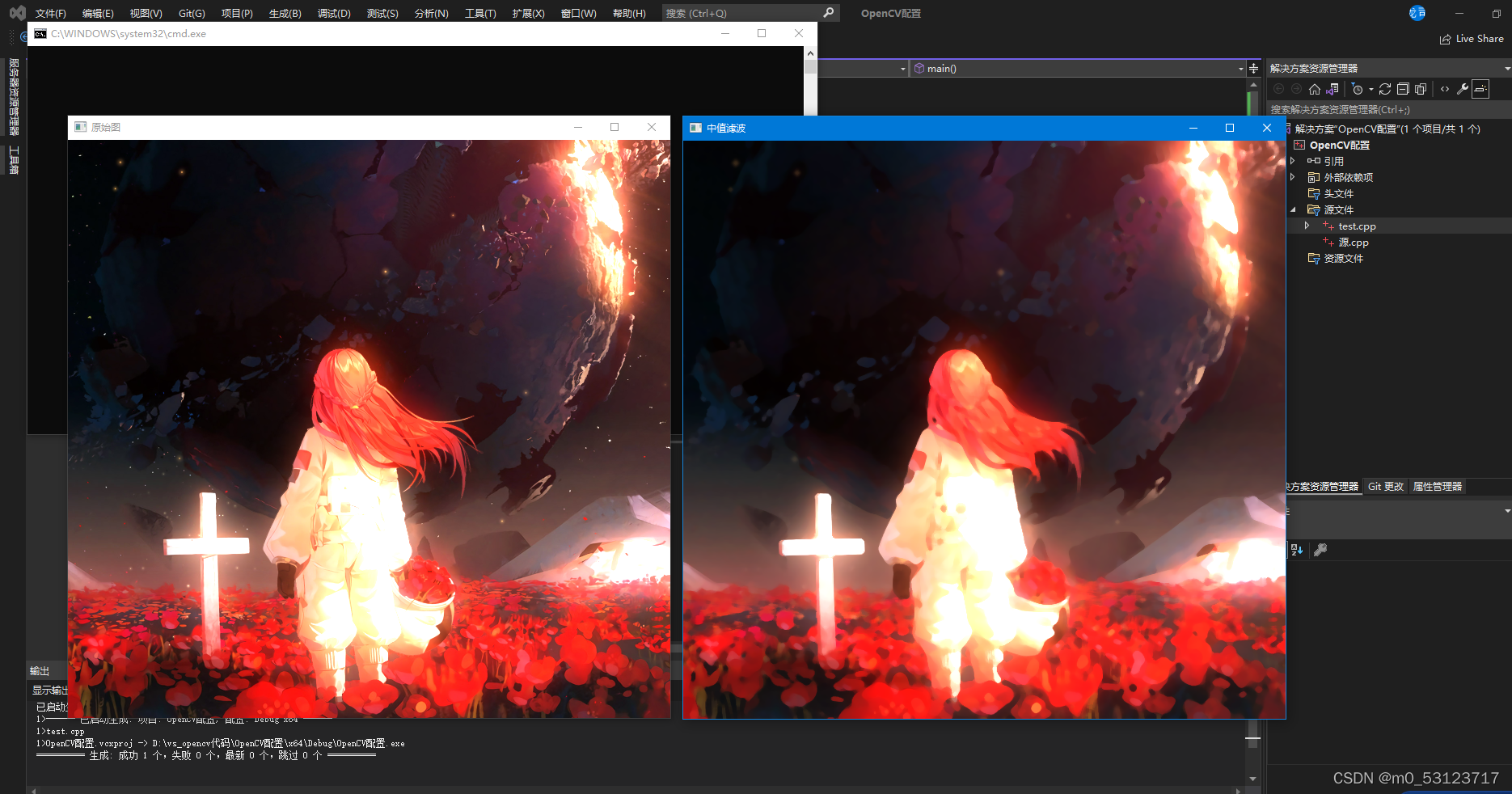? ? medianBlur函数使用中值滤波器来平滑(模糊)处理一张图片,从src输入,结果从 dst输出。对于多通道图片,它对每一个通道都单独进行处理,并且支持就地操作(In-placeoperation)。函数原型如下。 ? ? ?C++: void medianBlur(InputArray src,outputArray dst, int ksize)参数详解如下。 ? ? 第一个参数,InputArray类型的src,函数的输入参数,填1、3或者4通道的Mat类型的图像。当 ksize为3或者5的时候,图像深度需为CV_8U、CV_16U、CV_32F其中之一,而对于较大孔径尺寸的图片,它只能是cV_8U。 ? ? 第二个参数:OutputArray类型的 dst,即目标图像,函数的输出参数,需要和源图片有一样的尺寸和类型。我们可以用 Mat::Clone,以源图片为模板,来初始化得到如假包换的目标图。 ? ? 第三个参数:int类型的ksize,孔径的线性尺寸(aperture linear size),注意这个参数必须是大于1的奇数,比如:3、5、7、9…… 调用范例如下。