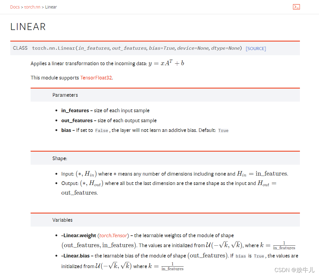 ????????线性层参数 in_features 就是输入x,out_features 是线性层的输出是上图的g。x到g的关系式为: ,其中的 是权重, 是偏置(参数bias为True时,才存在)。阅读官方文档可知,weight和bias都是从分布中采样初始化,经过训练得最终结果。