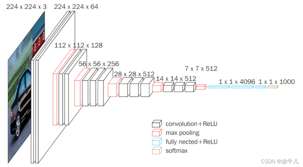 在vgg16模型中,?将224*224*3的图片转变为了1*1*4096的大小,经过训练,得到最终的1*1*1000的结果。?