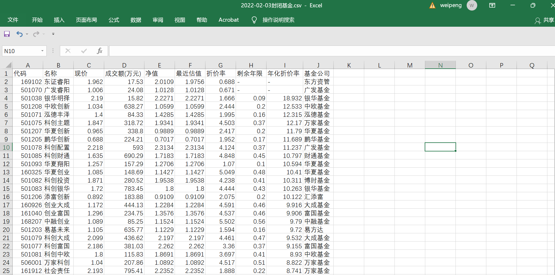 csv_writer.writerow(["代码","名称","现价","成交额(万元)","净值","最近估值","折价率","剩余年限","年化折价率","基金公司"])