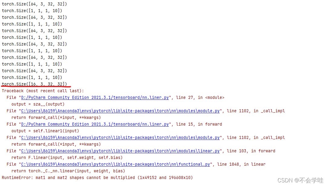?问题解决:由于我们设置的in_features是固定的,然而在我们的数据集中,由于dataloader的batch_size为64,因而in_features大部分为196608,然而最后dataloader的drop_last默认为false,因而最后一组为16张,故而不满足in_features。解决办法就是将drop_last设置为true