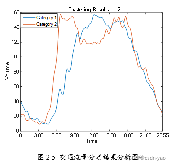 图2-4中(a)、(b)、(c)、(d)分别为k取2、3、4、5下的聚类结果,横坐标为时间,纵坐标为交通流量值。从4种不同k值的聚类结果中可直观且全面地看出不同聚类结果中的交通流量拥有相似的变化规律,仅存在数值大小的差异。相比于(a)中的聚类结果,其它聚类结果中新增的交通流量种类更像是(a)中两种交通流量值的整体上移或下降。这也表明了k值取2最为合理  通过图2-3不同k值下的轮廓系数以及图2-4不同k值下的聚类结果分析可知,当k值取2时的聚类结果为最优。因此将交通流量划分为两种类别。