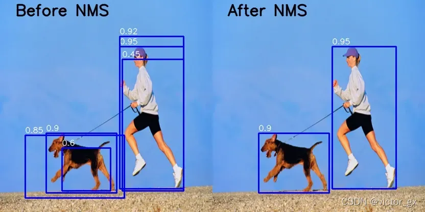 在这个阶段,我们为IOU定义了一个额外的阈值。此阈值用于删除具有高重叠度的框。其原因如下:如果两个框有大量重叠,并且它们也属于同一类,则很可能两个框都覆盖了同一对象(我们可以从上图验证这一点)。由于真实情况是每个对象只有一个框,因此我们尝试删除置信度较低的框。