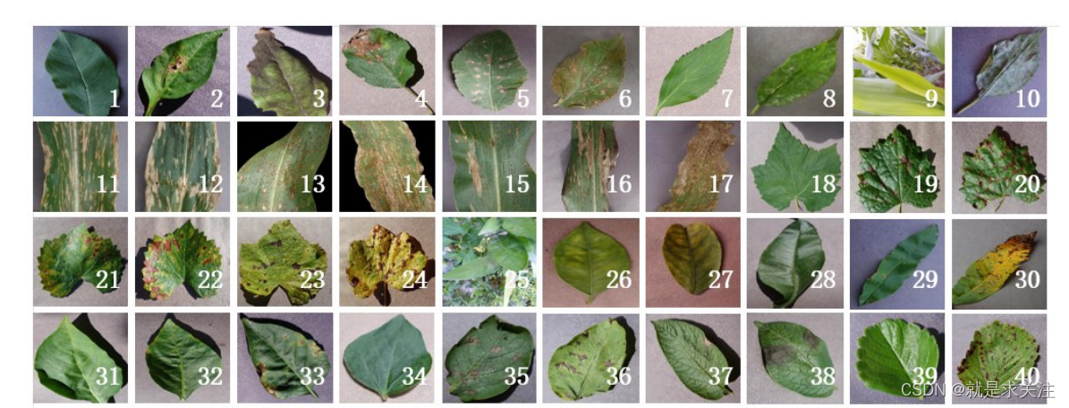 为了验证该方法对于植物病害多分类识别问题的有效性,本实验使用 Plant Village 公开数据集。 数据集图片如图 所示。该数据集隶属于宾夕法尼亚州州立大学,其官方网站提供了大量各类植物病害图片以方便有关学者的研究工作。