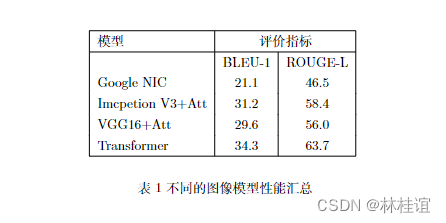 受时间限制,我们针对四个模型都采取在EPOCH=60的条件下进行比对,且针对100幅一样的图进行模型预测。我们可以清楚的发现模型关于BLEU和ROUGE的评分标准从小到大分别是NIC、VGG16+Att、Imception V3+Att、Transformer。我们可以看出Imception V3模型是优于VGG16的,在模型部分可以清楚的看出层数也远远高于它,而Transformer作为最近流行的模型,无论是在训练速度还是评分结果上面都好于其他模型。