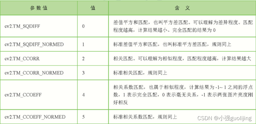 一、简介 模板匹配是一种最原始,最基本的识别方法,可以在原始图像中寻找出特定图像的位置,模板匹配经常应用于简单的图像查找场景中,例如,在集体合照中找到某个人的位置。 二、模板匹配方法 1、模板是被查找的目标图像,查找模板出现在原始图像中的哪个位置的过程就叫做模板匹配,OpenCV提供的matchTemplate()方法就是模板匹配方法 result = cv2.matchTemplate(image, temp1, method, mask) image:原始图像 temp1:模板图像,尺寸必须小于或者等于原始图像 mask:可选参数,掩模,只有cv2.TM.SQDIFF和cv2.TM_CCORR_NORMED支持此参数,建议采用默认值