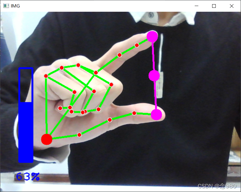 手势识别和追踪原理在之前的博客已经详述过了,对音量的控制是通过Mediapipe实时检测得出的拇指指尖和食指指尖的坐标,再通过坐标计算出两者距离,并将距离处理为参数调用pycaw中相关的音量控制函数实现手势对音量的实时控制,并且利用Opencv画出柱状图像以显示音量的实时大小。